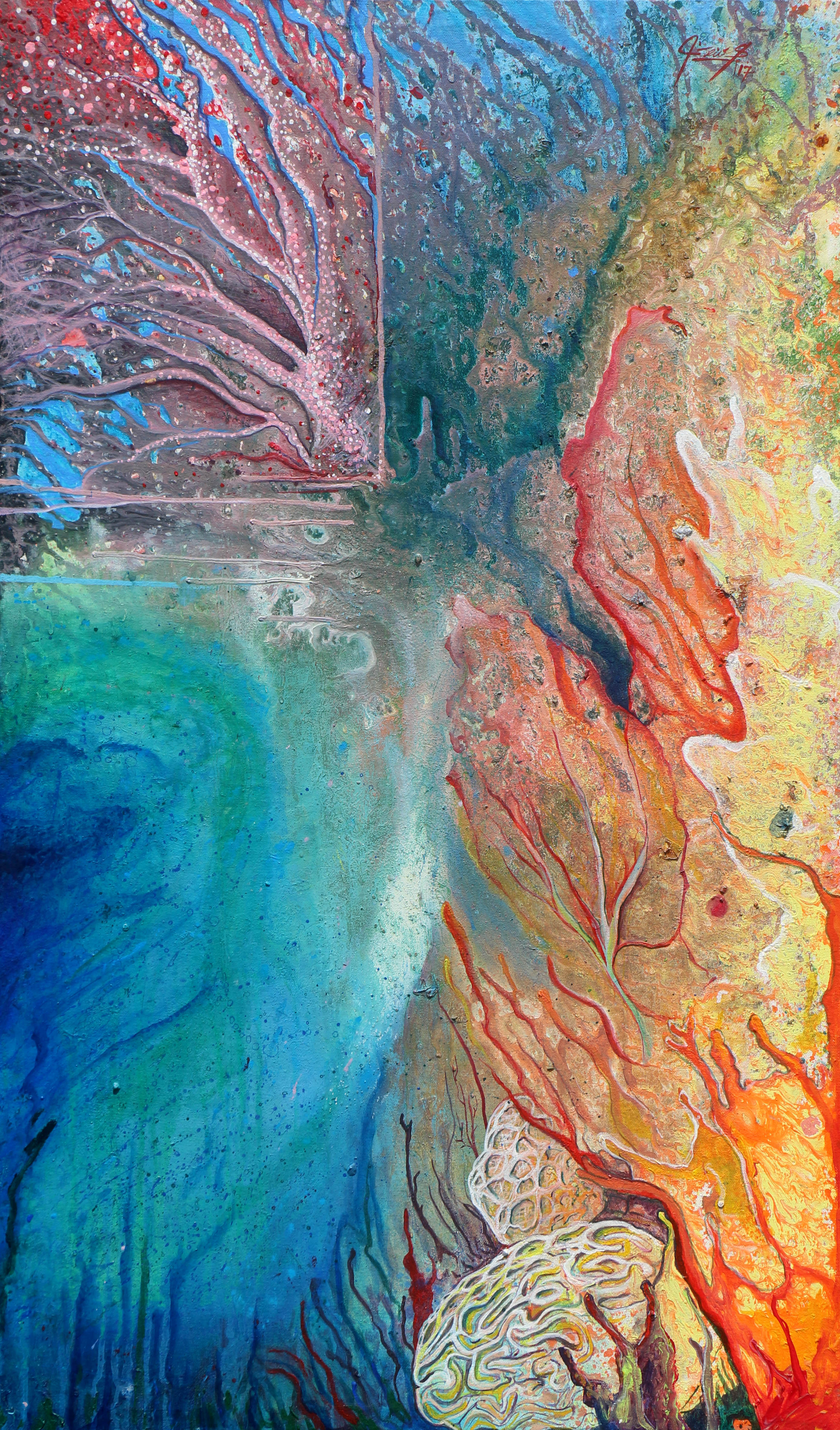 En Arrecife, Javier Eliú nos sumerge en un universo subacuático que invita tanto a quienes no se atreven a explorar las profundidades como a quienes aún guardan la memoria de haberse maravillado frente a este ecosistema vivo. Su obra trasciende la estética para convertirse en un acto de activismo artístico, un puente entre la contemplación y la conciencia. El arrecife, corazón vibrante del Caribe, es una pieza fundamental del equilibrio natural. En esta exposición, Javier Eliú recrea su riqueza, diversidad y fragilidad, permitiéndonos vislumbrar un mundo que muchas veces damos por sentado. Cada obra es un recordatorio de la conexión íntima entre nosotros y el entorno marino, y de la responsabilidad que tenemos en su preservación.