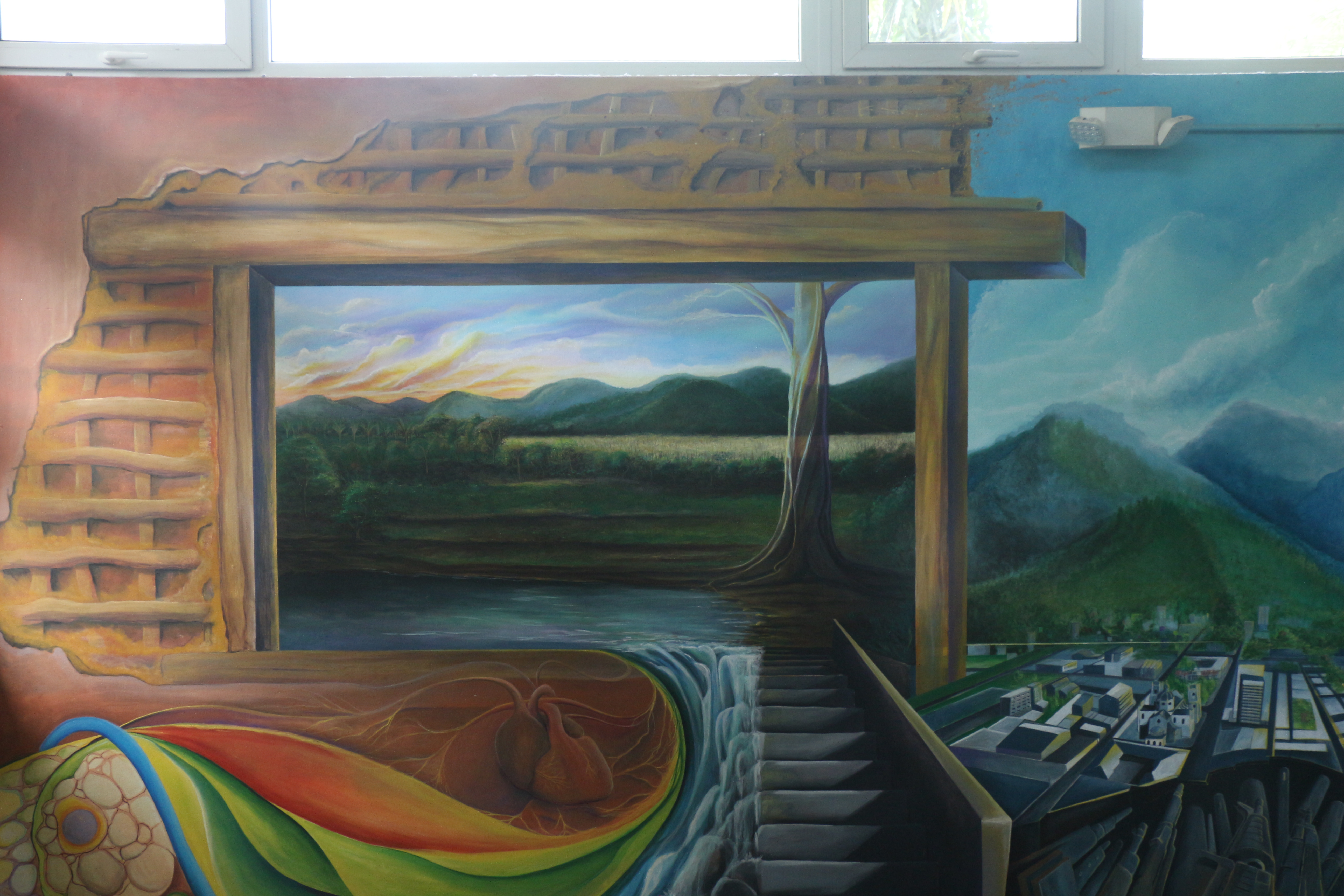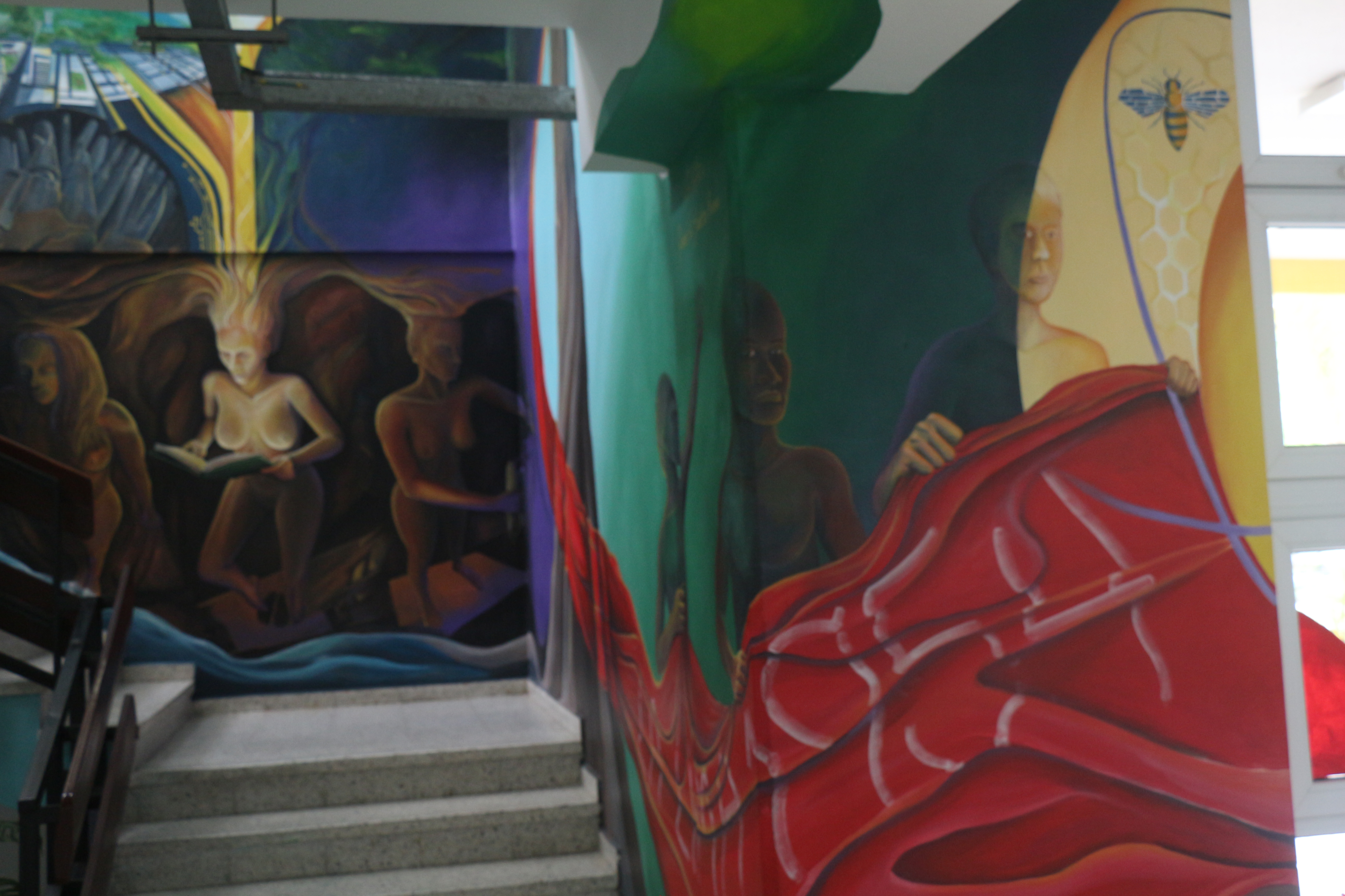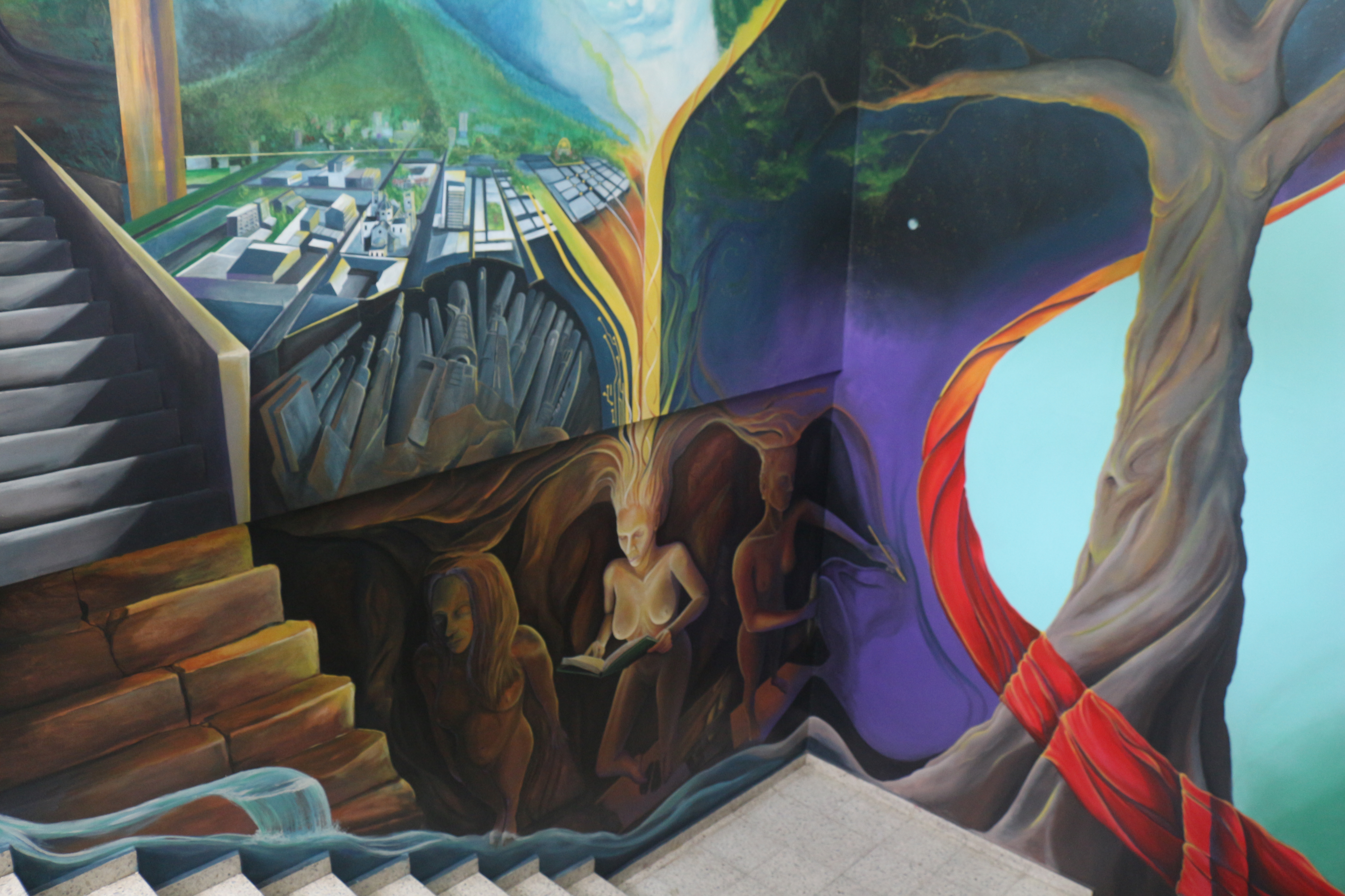 La composición, marcada verticalmente con un árbol de ceiba, símbolo del árbol de la vida para los mayas, desde cuyas raíces emerge la cariátide del conocimiento ancestral. Esta figura sostiene una planta de maíz, emblema del sustento histórico de Latinoamérica, y escribe para transmitir su sabiduría. En el centro, otra cariátide representa el conocimiento académico contemporáneo, especialmente el papel fundamental de las mujeres en el avance social y científico. El recorrido culmina con la figura del conocimiento mal empleado, que sostiene armas, una advertencia sobre el uso destructivo de la inteligencia y su impacto en la sociedad.