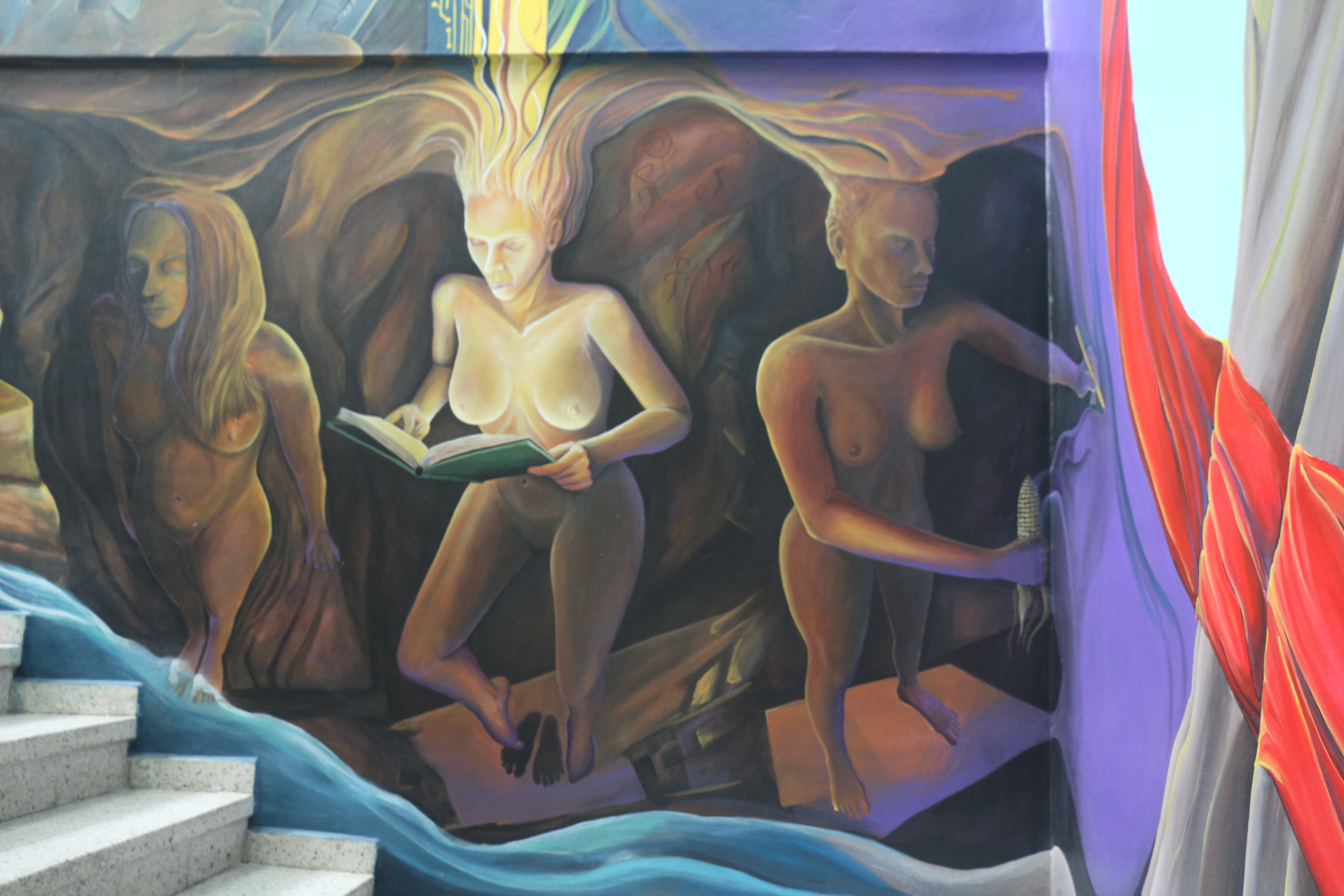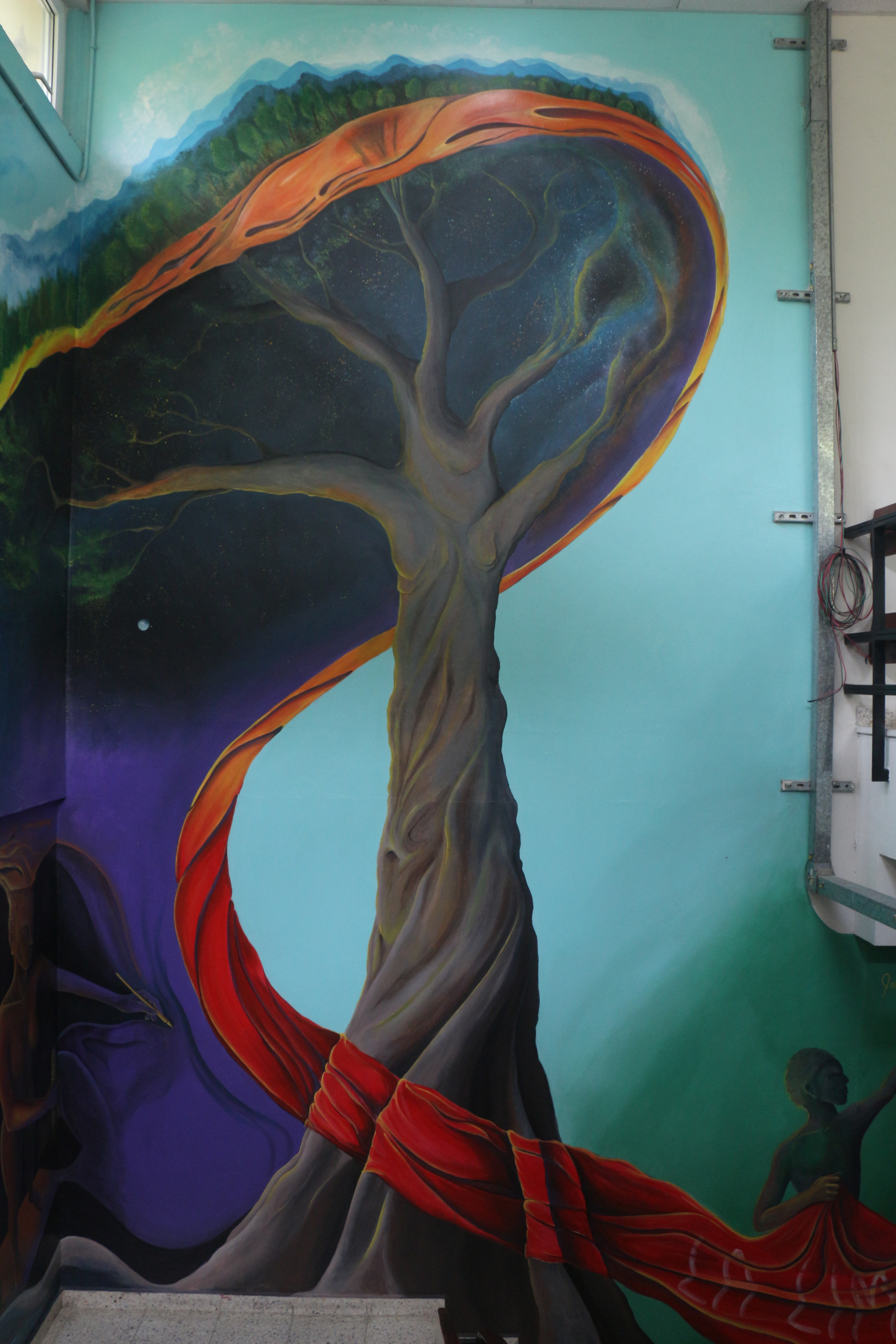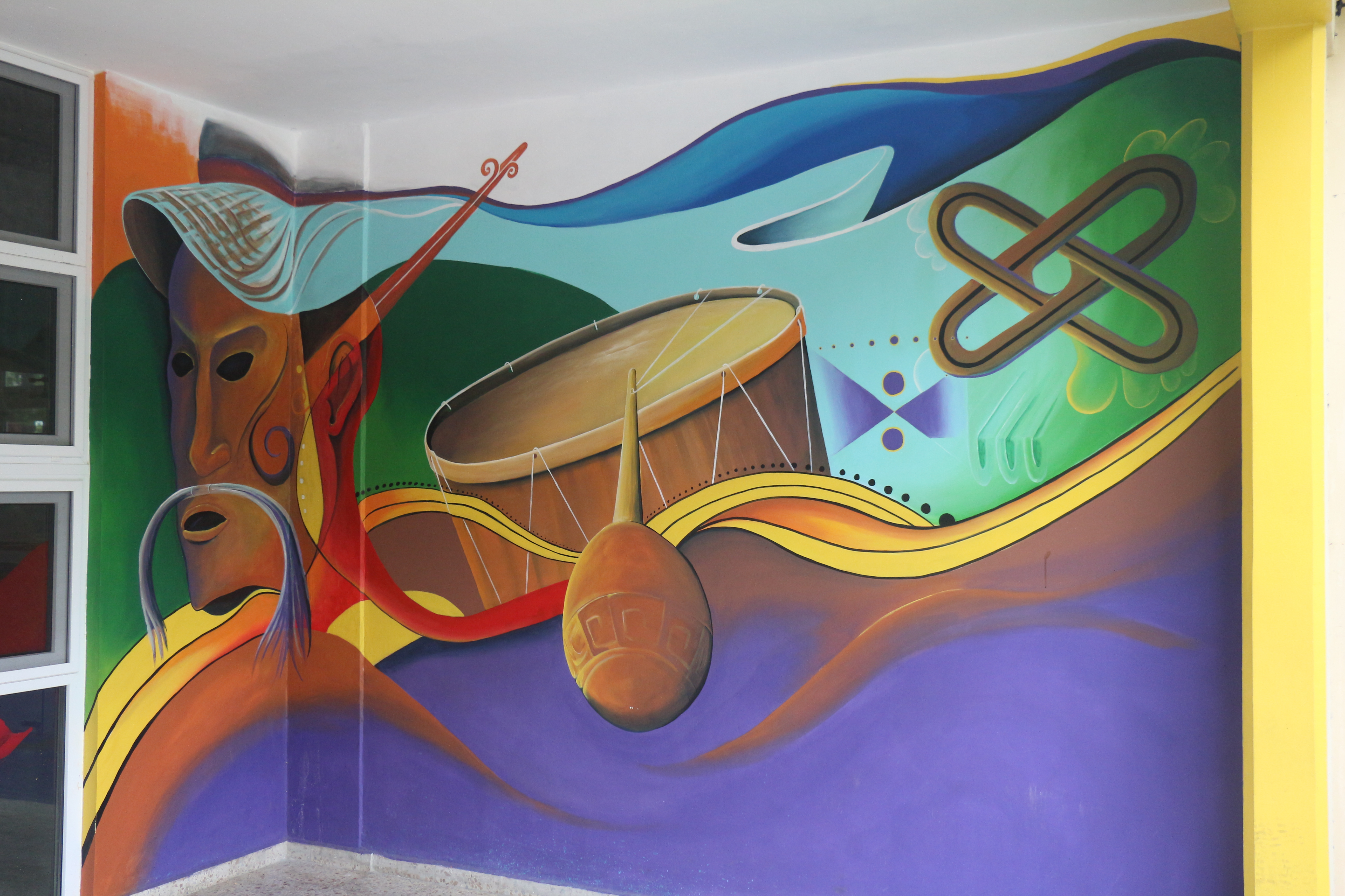 La composición, marcada verticalmente con un árbol de ceiba, símbolo del árbol de la vida para los mayas, desde cuyas raíces emerge la cariátide del conocimiento ancestral. Esta figura sostiene una planta de maíz, emblema del sustento histórico de Latinoamérica, y escribe para transmitir su sabiduría. En el centro, otra cariátide representa el conocimiento académico contemporáneo, especialmente el papel fundamental de las mujeres en el avance social y científico. El recorrido culmina con la figura del conocimiento mal empleado, que sostiene armas, una advertencia sobre el uso destructivo de la inteligencia y su impacto en la sociedad.