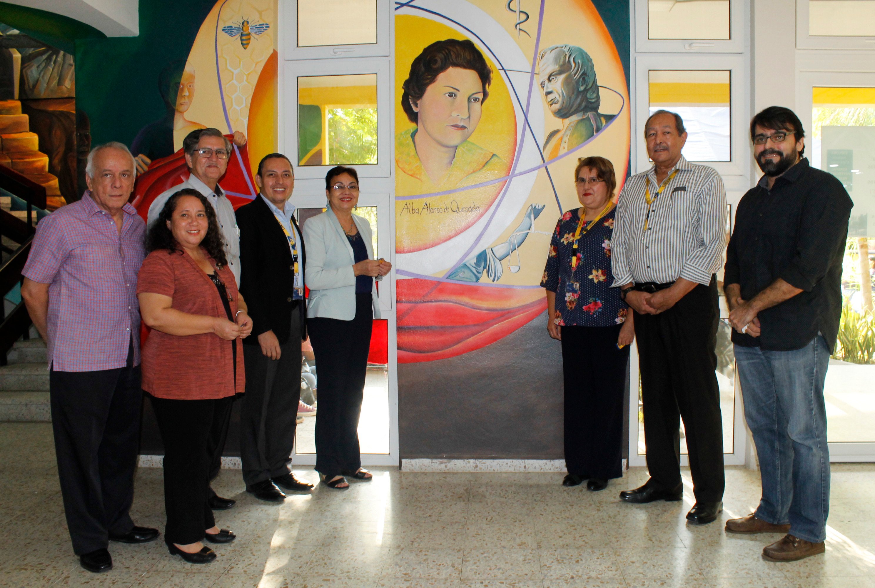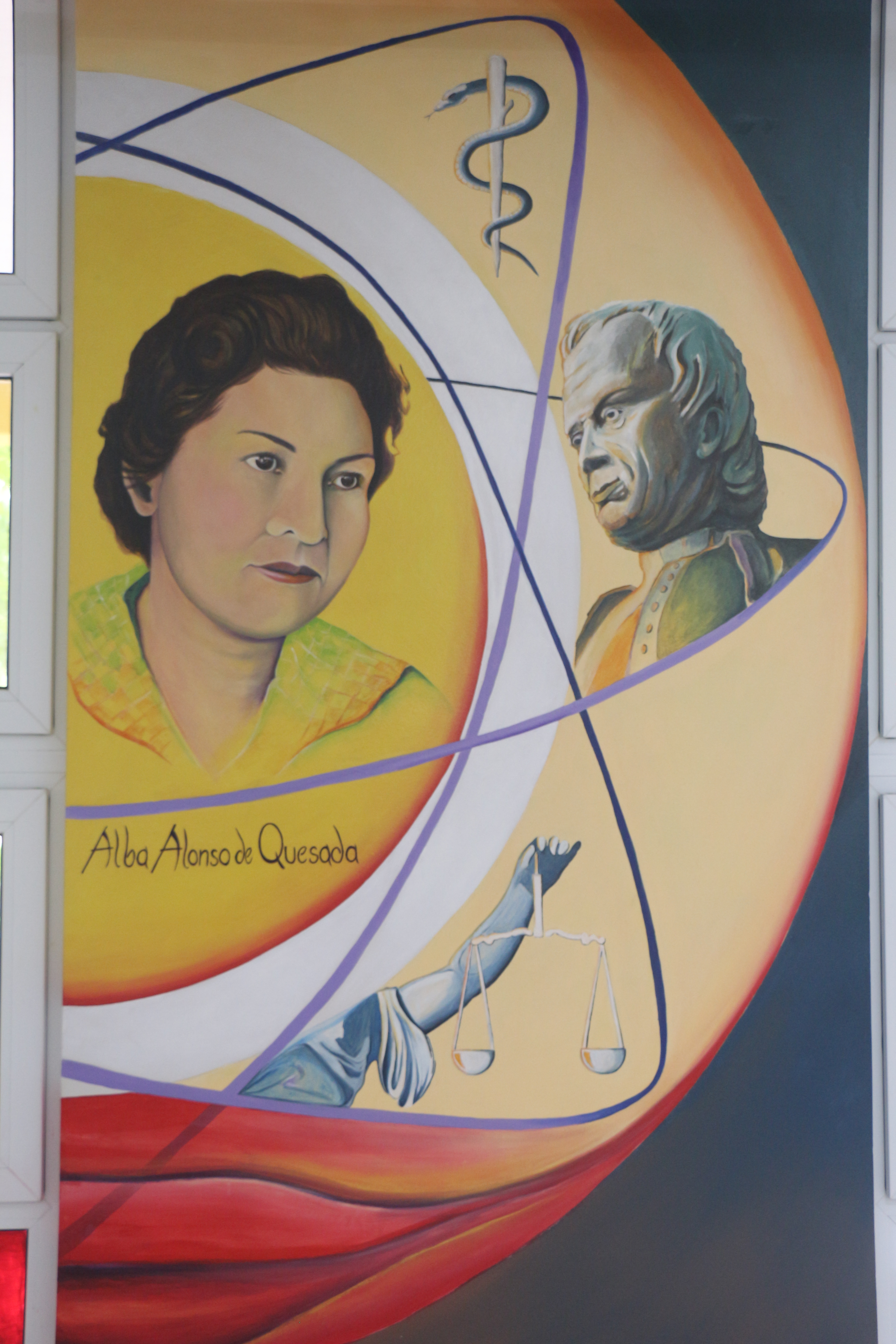 Además, Es por el agua rinde homenaje a figuras esenciales de la historia hondureña. Doña Alba Alonso de Quesada, primera mujer graduada de la UNAH y defensora de los derechos de las mujeres, aparece junto al presbítero José Trinidad Reyes, fundador de la universidad. También incluye referencias a la huelga obrera de 1954, un momento decisivo para el desarrollo económico del Valle de Sula, y a los pilares fundamentales de una sociedad: salud, educación y justicia, representados en un átomo que simboliza espacio y tiempo.