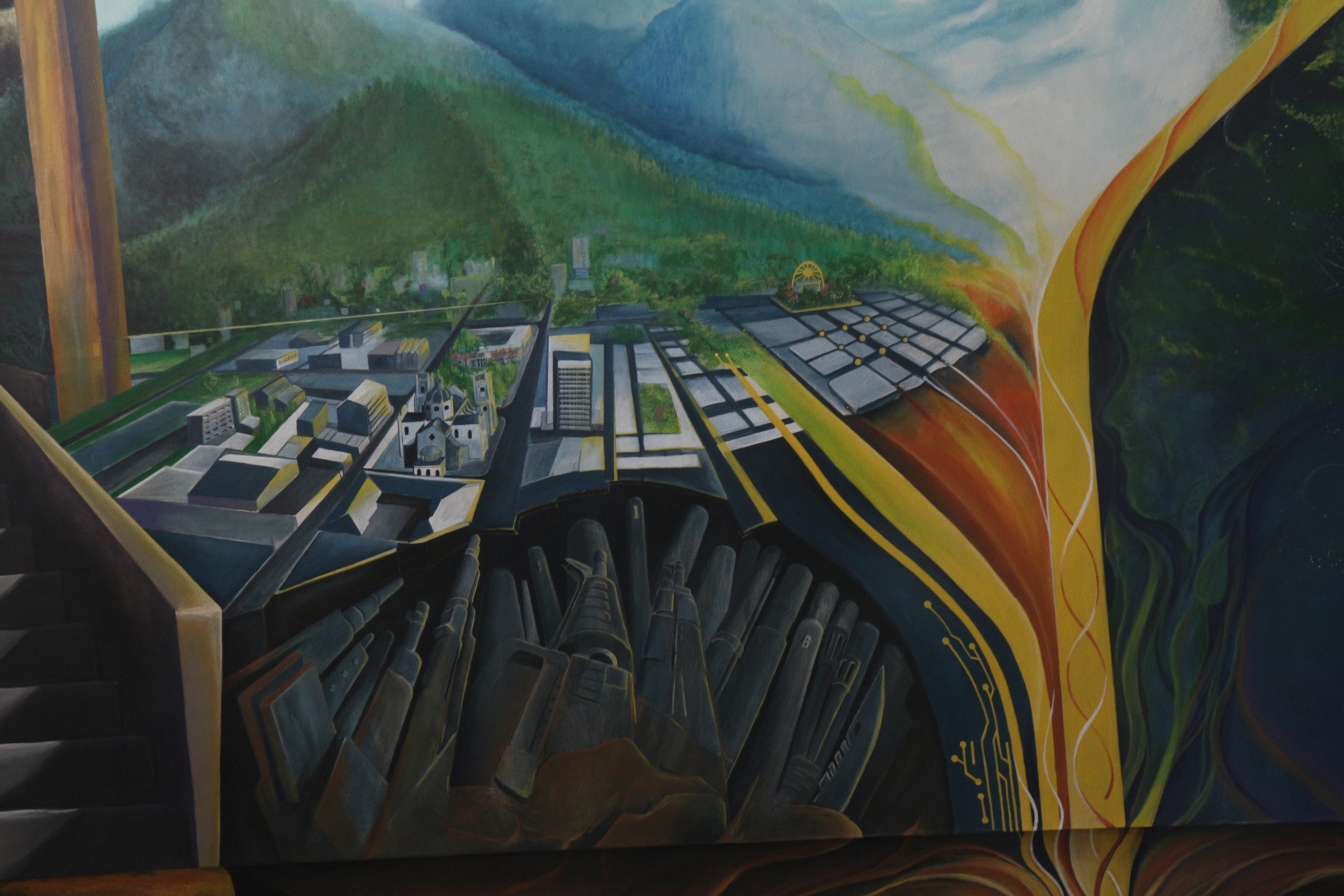 El mural destaca la relación entre la naturaleza y el ser humano, representada por una cordillera que da origen a los recursos vitales. Sin embargo, esta es amenazada por el crecimiento urbano desmedido, una metáfora de la lucha entre progreso y sostenibilidad. Una vista macro de la estructura de una orquídea evoca la evolución y la necesidad de un equilibrio armónico con el entorno. La obra se humaniza con un corazón, recordándonos que la humanidad no puede sobrevivir sin sus recursos naturales.